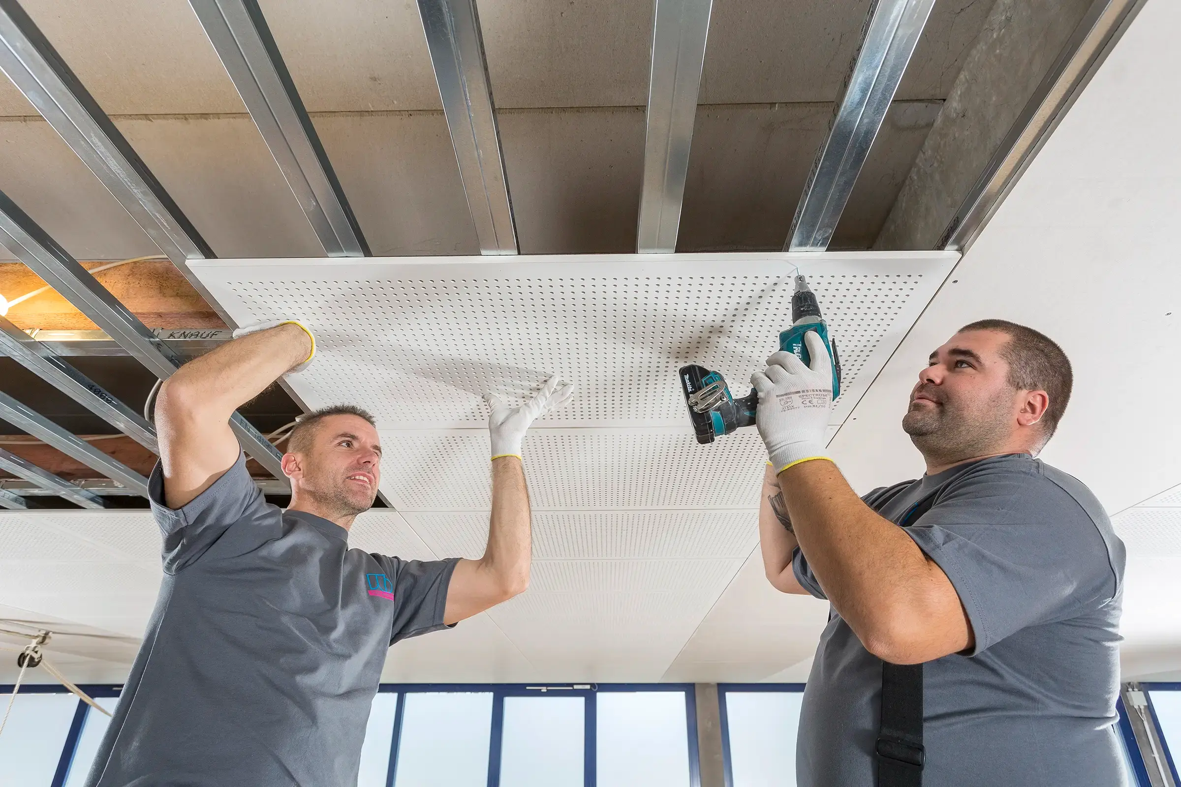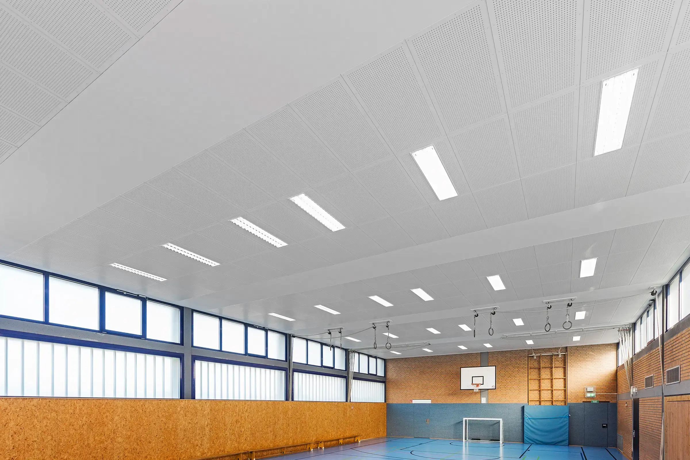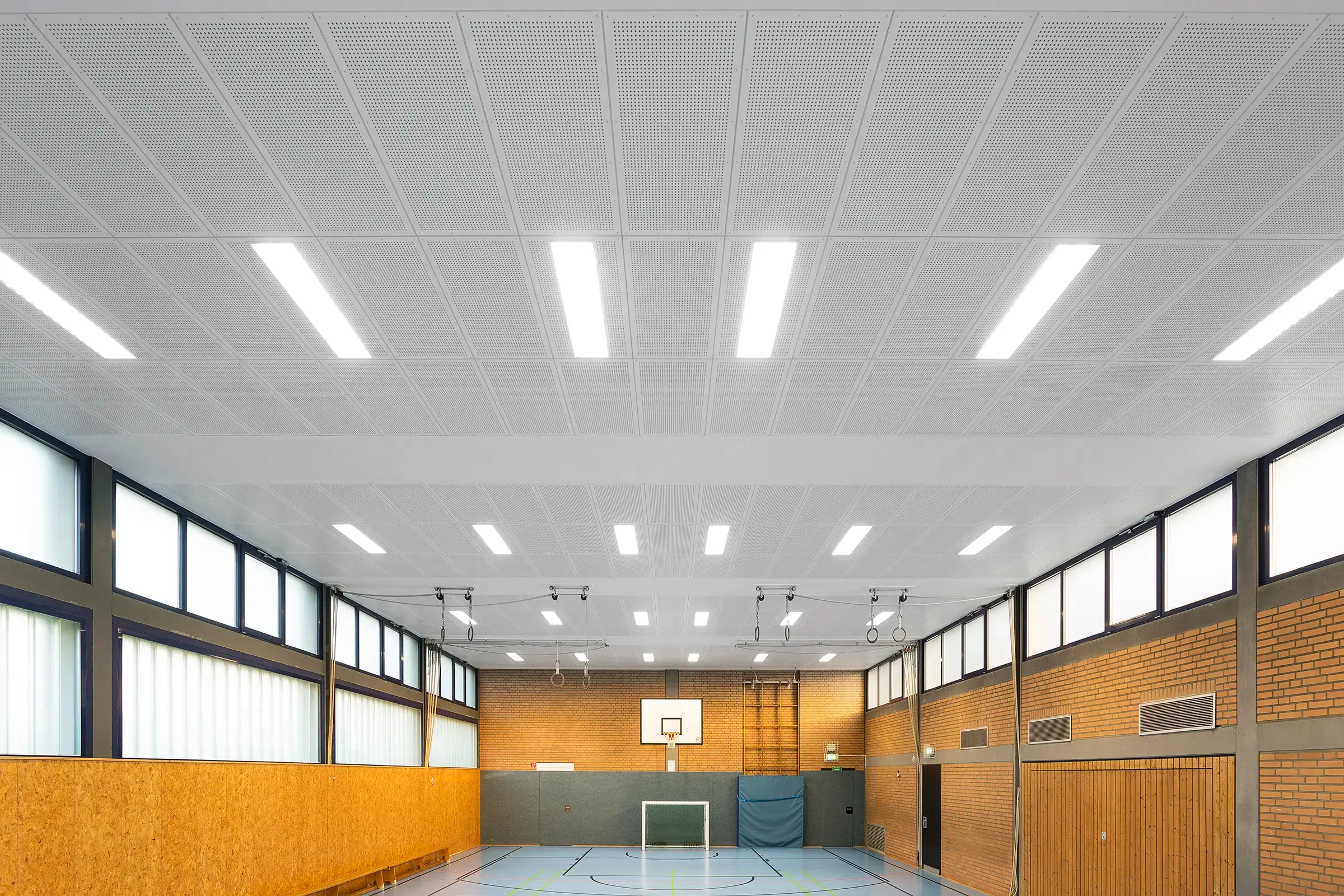 In Trockenbauweise wurde eine neue Schallschutzdecke montiert. Später erstellten wir die Abschlussfotos der fertigen Halle.